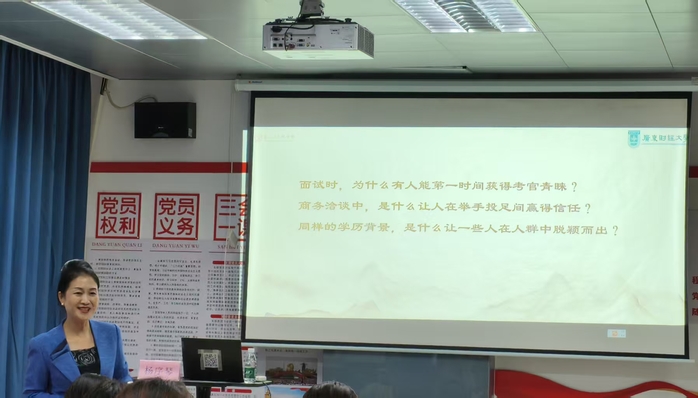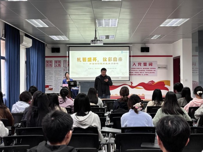 11月4日下午,国际商学院特邀贵州省礼仪学会会长、贵州大学教学名师杨序琴副教授在佛山校区有为书院9栋102党团活动室开展“礼若盛开,仪彩自来——开启你的隐形竞争力密码”主题讲座。讲座由院长段军山主持,40余名学生代表参加。