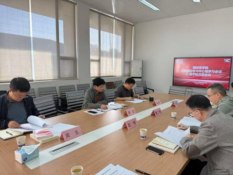 11月26日下午,国际商学院党委在佛山校区厚德楼539召开党委理论学习中心组(扩大)学习会,传达学习贯彻习近平总书记视察广东和出席第十五届全国运动会开幕式重要讲话重要指示精神。学习会由学院党委书记郭显军主持,学院领导班子成员、党委委员和党支部书记参加,学校副处级党建督导员黄进到会指导。