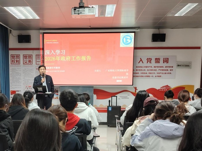 郭显军以“深入学习2026年政府工作报告”为主题,围绕“十五五”开局之年的战略定位,系统回顾了“十四五”期间我国取得的历史性成就,深入解读2026年国家经济社会发展的宏观背景与现实考量,并对“更加积极的财政政策+适度宽松的货币政策”这一政策组合拳进行深入浅出的阐释。围绕新质生产力培育、全国统一大市场构建、民生福祉保障等政府工作报告中的重点任务,他鼓励学生主动把握时代脉搏,要立足所长,勤学善思、笃行实干,主动将专业知识与国家发展需求相结合,既要胸怀家国大局,也要脚踏实地锤炼过硬本领,在深化改革与科技创新的时代浪潮中勇担使命、主动作为,以青春之我助力国家高质量发展。